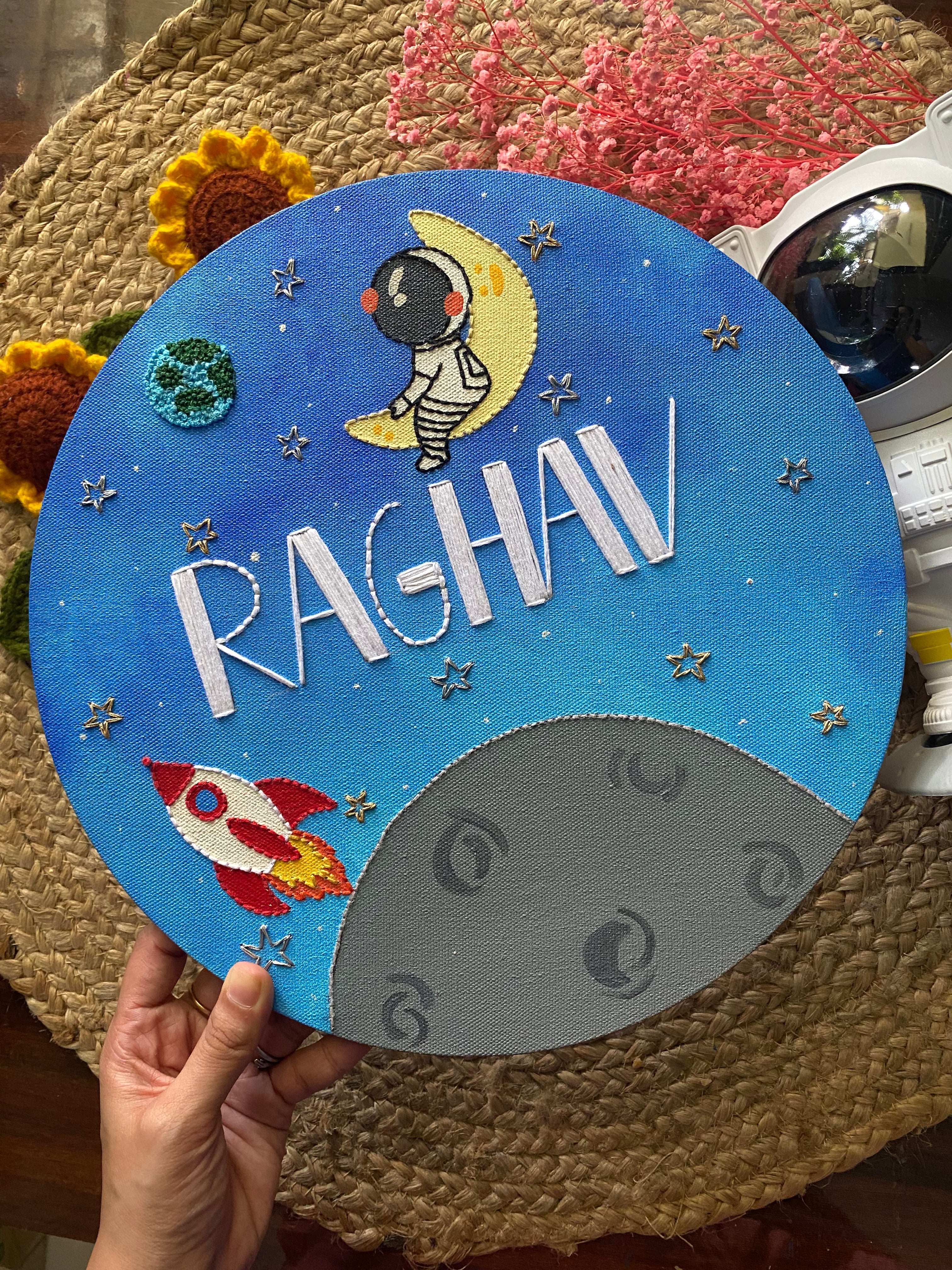 Is your kid in love with stars and space? You can customise this name plate with your kid's name! :)